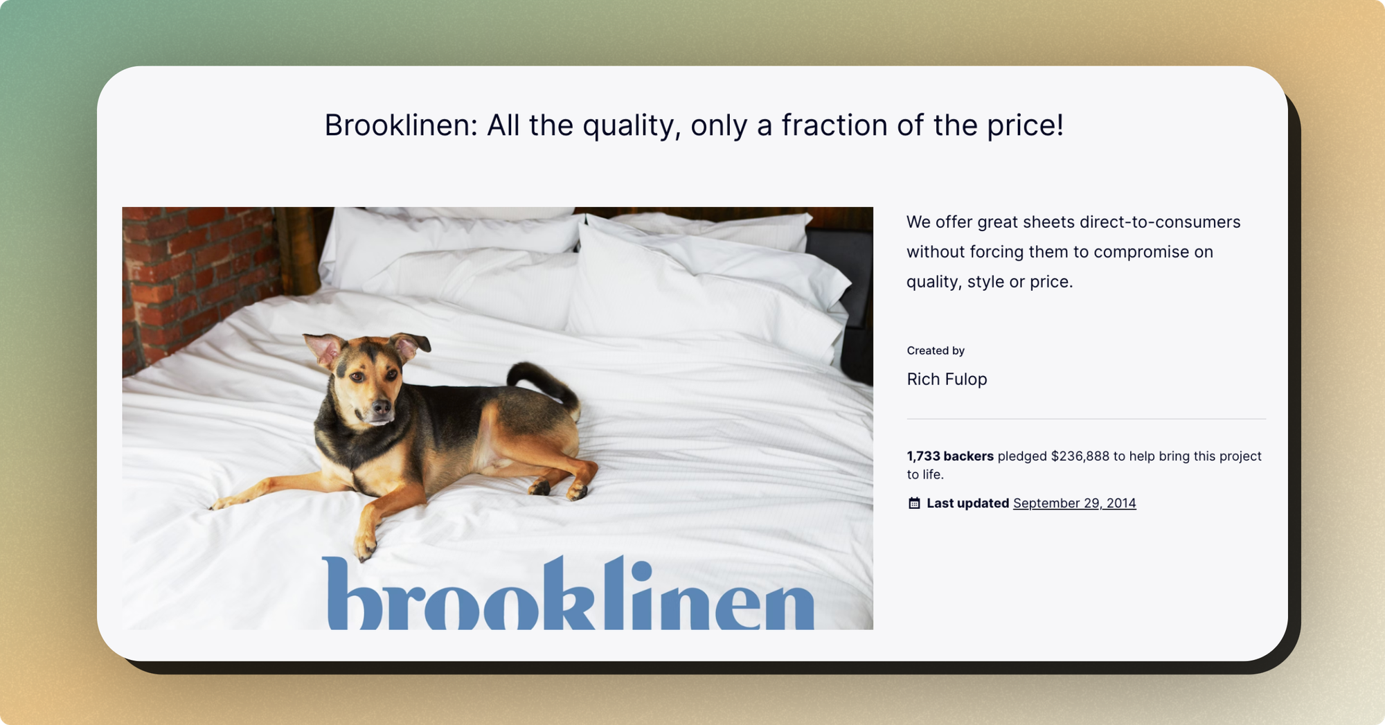 Before Brooklinen could be found in department stores and bedrooms across the nation, they raised $236,888 from 1,733 backers who pledged to help bring this incredible vision to life here on Kickstarter.