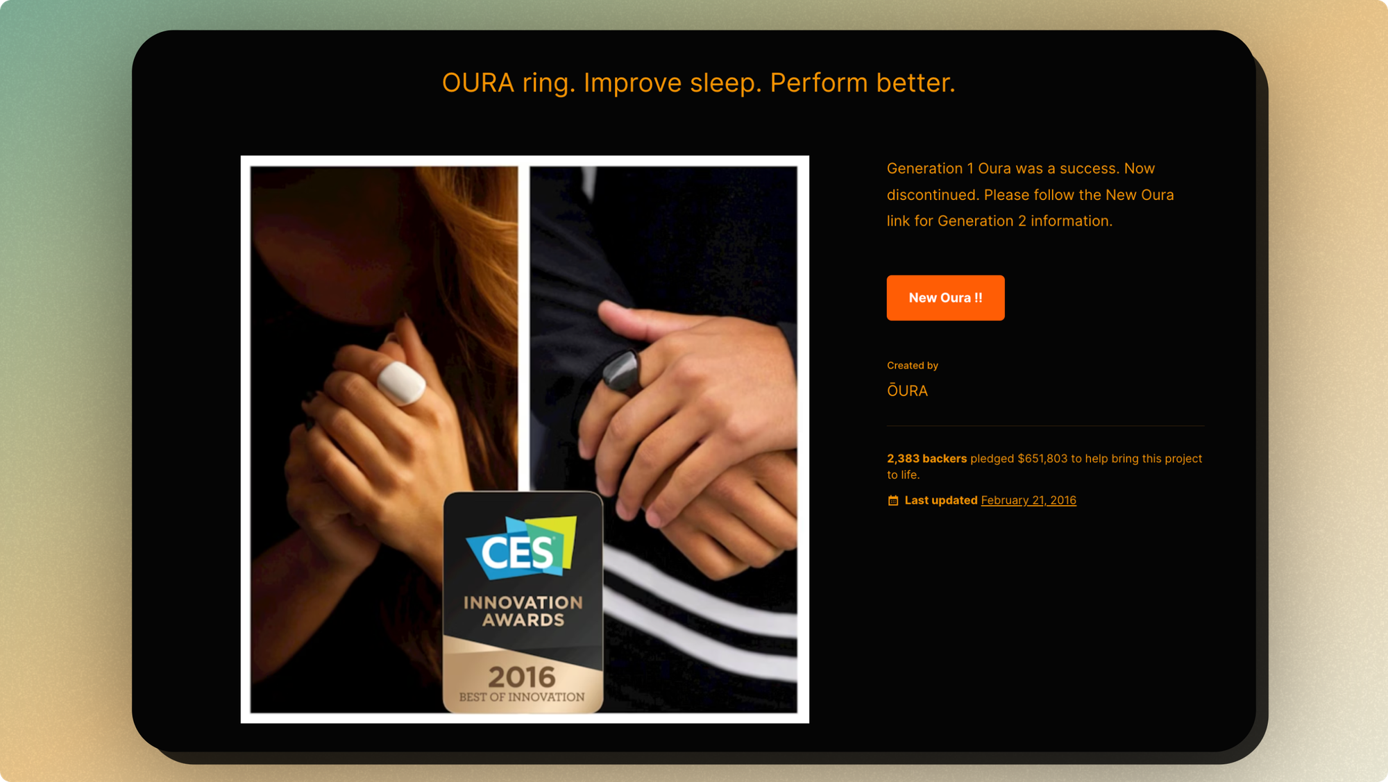 When The Oura ring team launched in 2015, they had a goal of raising $100,000. At the campaign's end date, they raised a whopping $651,803 from 2,383 backers worldwide and beautifully kept them up to date on the product's development at every stage of the journey.