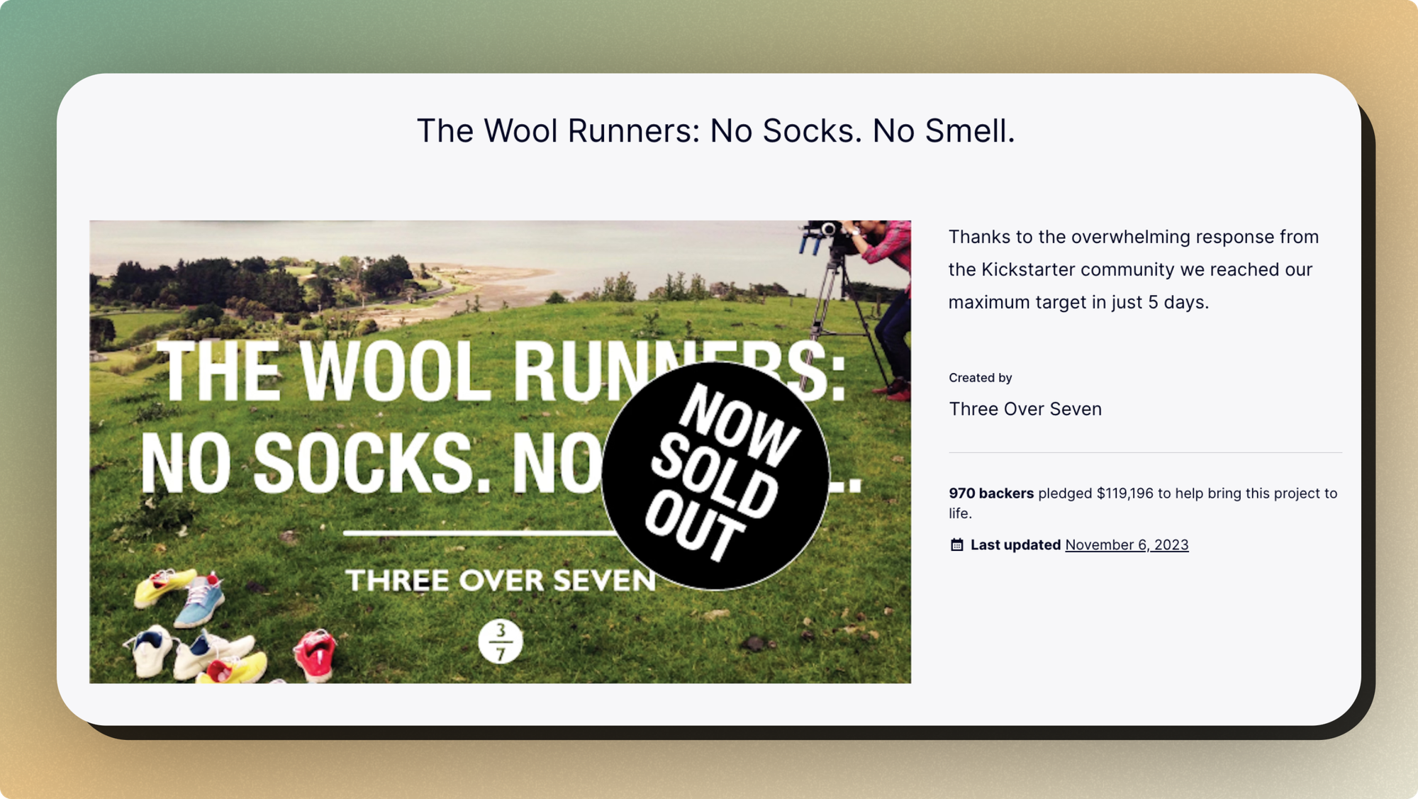 When the team at Allbirds launched their Kickstarter campaign, they received an overwhelming response of love from the backer community on the platform. In just 5 days, they hit their maximum pledge target, and while there were still 24 days left to run, they decided to stop the campaign at 1064 pairs to focus on delivering the very best possible product to their backers at a scale they were comfortable with. Their goal was to raise $30,000, but they sold out in 5 days and raised $119,196 from 970 backers.