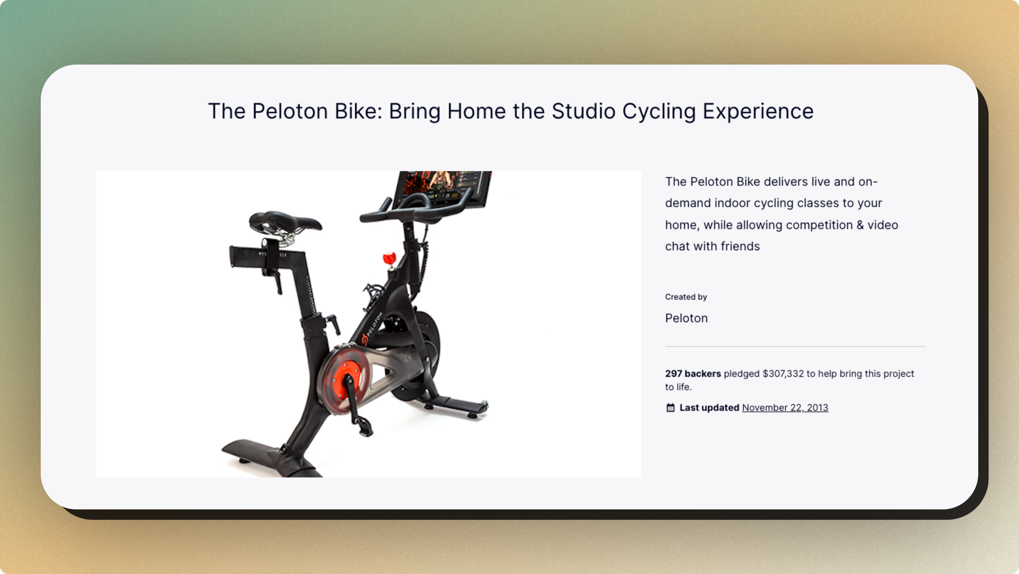 Peloton launched its Kickstarter campaign, "The Peloton Bike: Bring Home the Studio Cycling Experience" in June 2012. Their goal was to raise $250,000, but they ended up receiving $307,332 from 297 backers. With its sleek design, immersive technology, and motivating instructors, Peloton's bike became a status symbol and a must-have item for many fitness enthusiasts. The company's subscription-based model allowed users to access a wide variety of live and on-demand classes, creating a sense of community and motivation among its users.