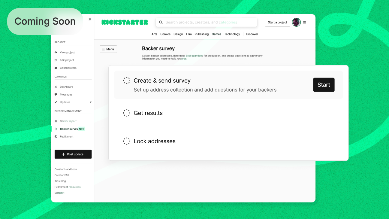 So, we're excited to announce upcoming enhancements to our Backer survey tool. In just a few weeks, Creators will experience a revamped survey tool on Kickstarter that: