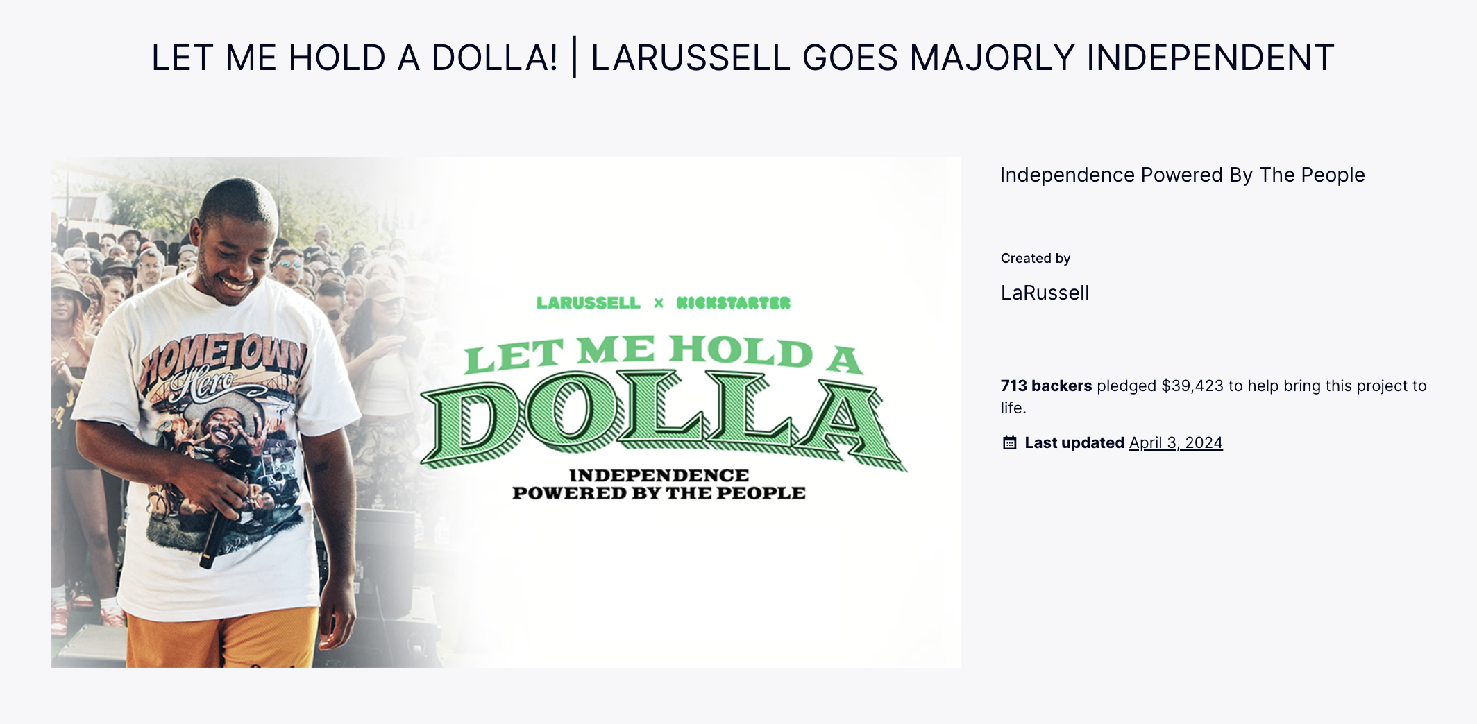 LaRussell serves as a great example of how independent musicians can use Kickstarter to maintain their independence. Renowned for his raw talent and entrepreneurial spirit, LaRussell collaborated with Kickstarter on his project "Let Me Hold A Dolla". The objective of this campaign was to connect with his million followers and ask for a minimal contribution of just $1 to support LaRussell's journey to stardom. The campaign aimed to test how far LaRussell could go on his own, with support from the public. LaRussell's campaign illustrates the potential for independent artists to use crowdfunding to maintain creative control and establish a direct relationship with their supporters. His story serves as an inspiration to many aspiring musicians who want to navigate the music industry on their own terms.