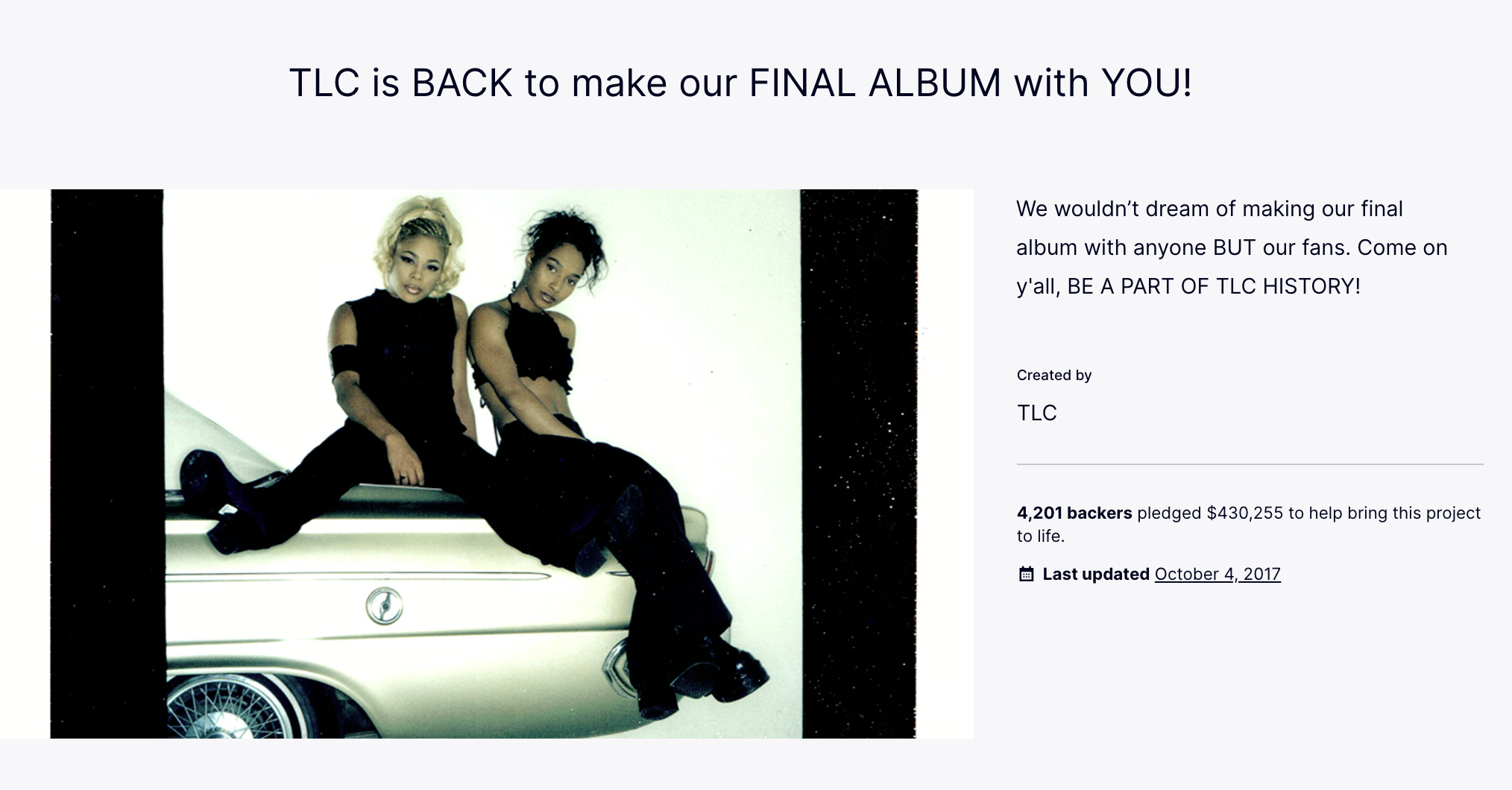In 2015, the iconic R&B group TLC turned to Kickstarter to fund their final album. Despite their storied career and significant fan base, the group needed a way to independently finance their project without the constraints of a traditional record label. Raising over $430,000 from more than 4,000 backers, far exceeding their initial goal of $150,000. The campaign’s success can be attributed to the group’s transparent and heartfelt appeal to their fans, offering exclusive rewards such as digital downloads, signed vinyl records, and even personalized voicemail messages from T-Boz and Chilli. By involving their fans directly in the funding process, TLC not only secured the necessary funds but also strengthened their bond with their supporters. The album, "TLC," released in 2017, stands as a testament to the power of crowdfunding and the enduring loyalty of their fan base.