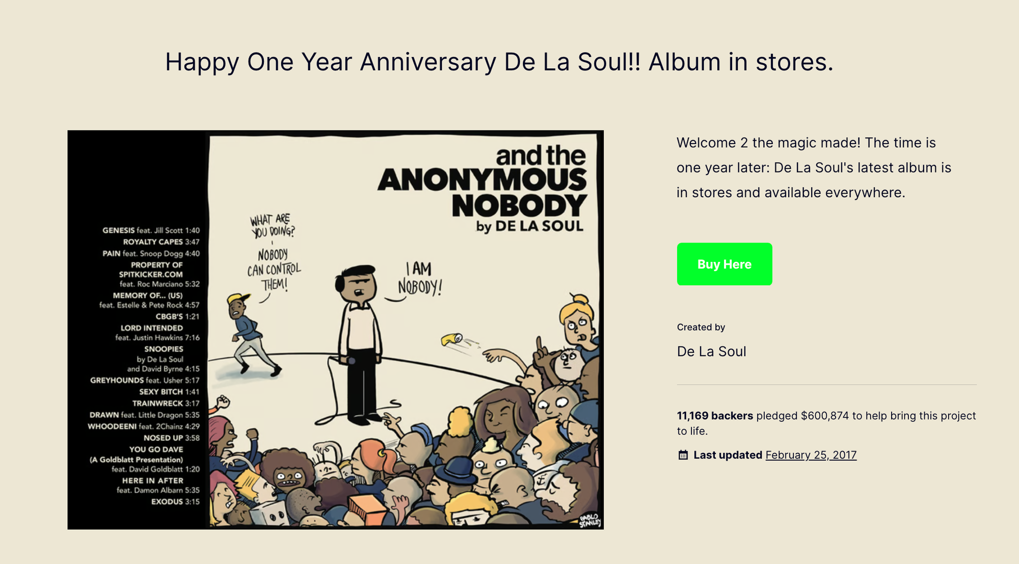 De La Soul faced a unique challenge: their classic albums were not available on digital streaming platforms due to complex sampling rights issues. In 2015, they decided to use Kickstarter to fund their first album in over a decade, "and the Anonymous Nobody." Their goal was to raise $110,000, but they ended up amassing over $600,000 from more than 11,000 backers. De La Soul’s campaign resonated with fans because it highlighted their commitment to creative freedom and maintaining control over their music. The rewards they offered included exclusive access to listening parties in NYC, limited edition merchandise, physical products, and personalized experiences, which helped to build excitement and engagement.