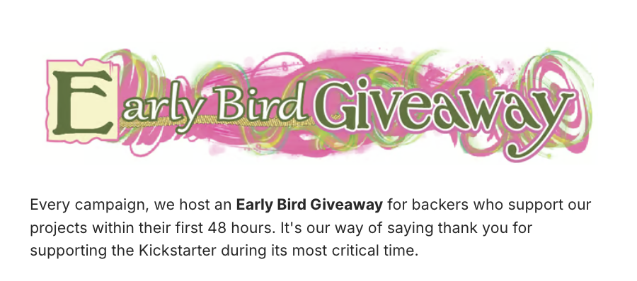 Campaigns that start strong tend to attract more attention. Early-bird rewards encourage early pledges, which can help your project reach its funding goal faster and potentially get featured on additional marketing channels.