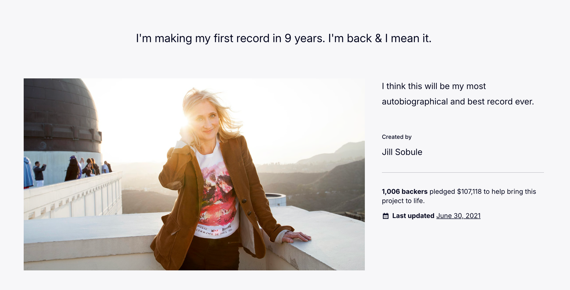 In September 2018, musician Jill Sobule sat down with our sister site, The Creative Independent. The interview coincided with her first official Kickstarter campaign, but Sobule’s connection to this community started long before she launched a project here.