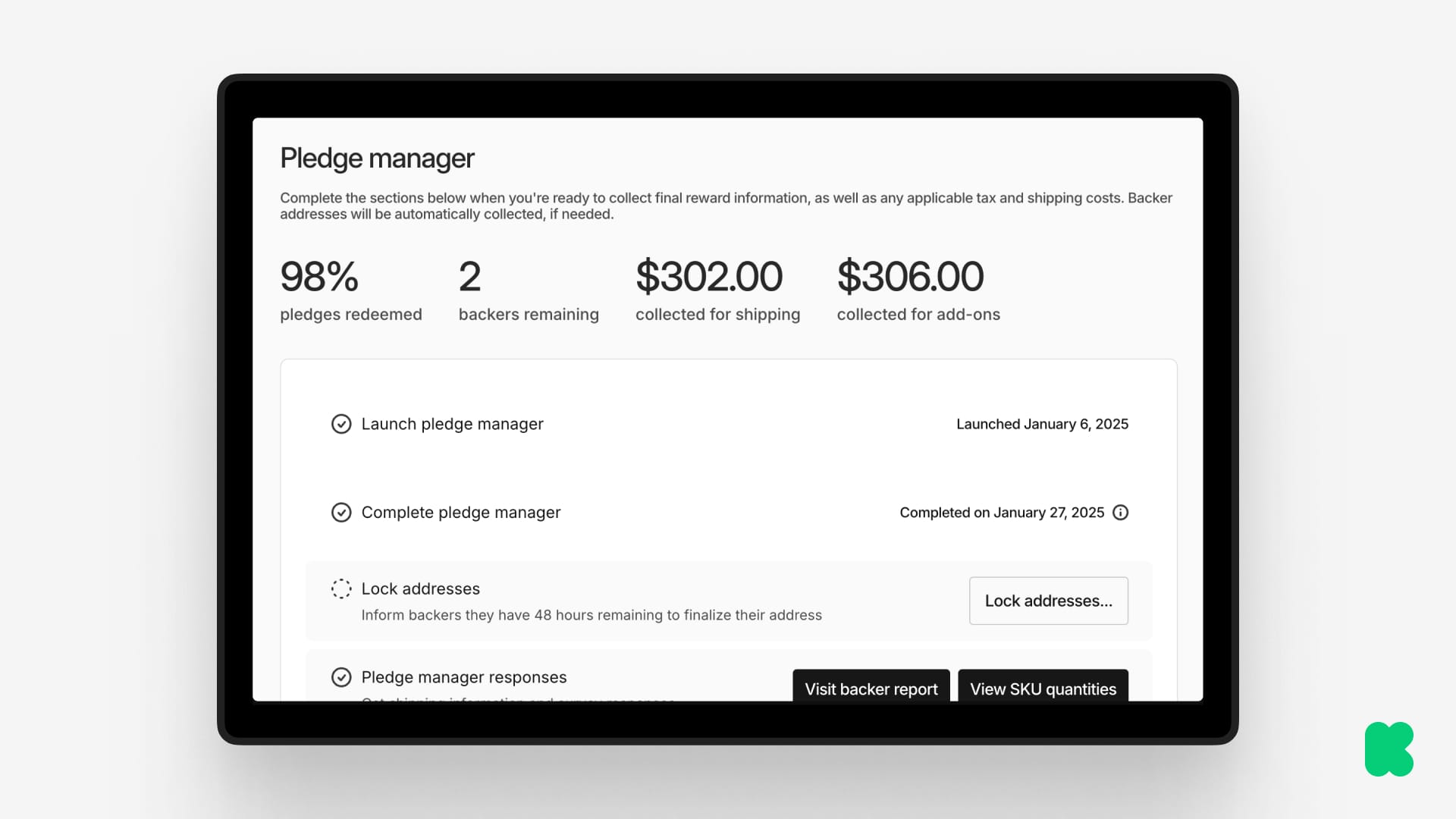 A native, built-in pledge manager has been one of our most-requested features. We’re excited to start rolling it out to help simplify post-campaign logistics and fulfillment, and make it easier than ever for creators to deliver on their promises to backers.
