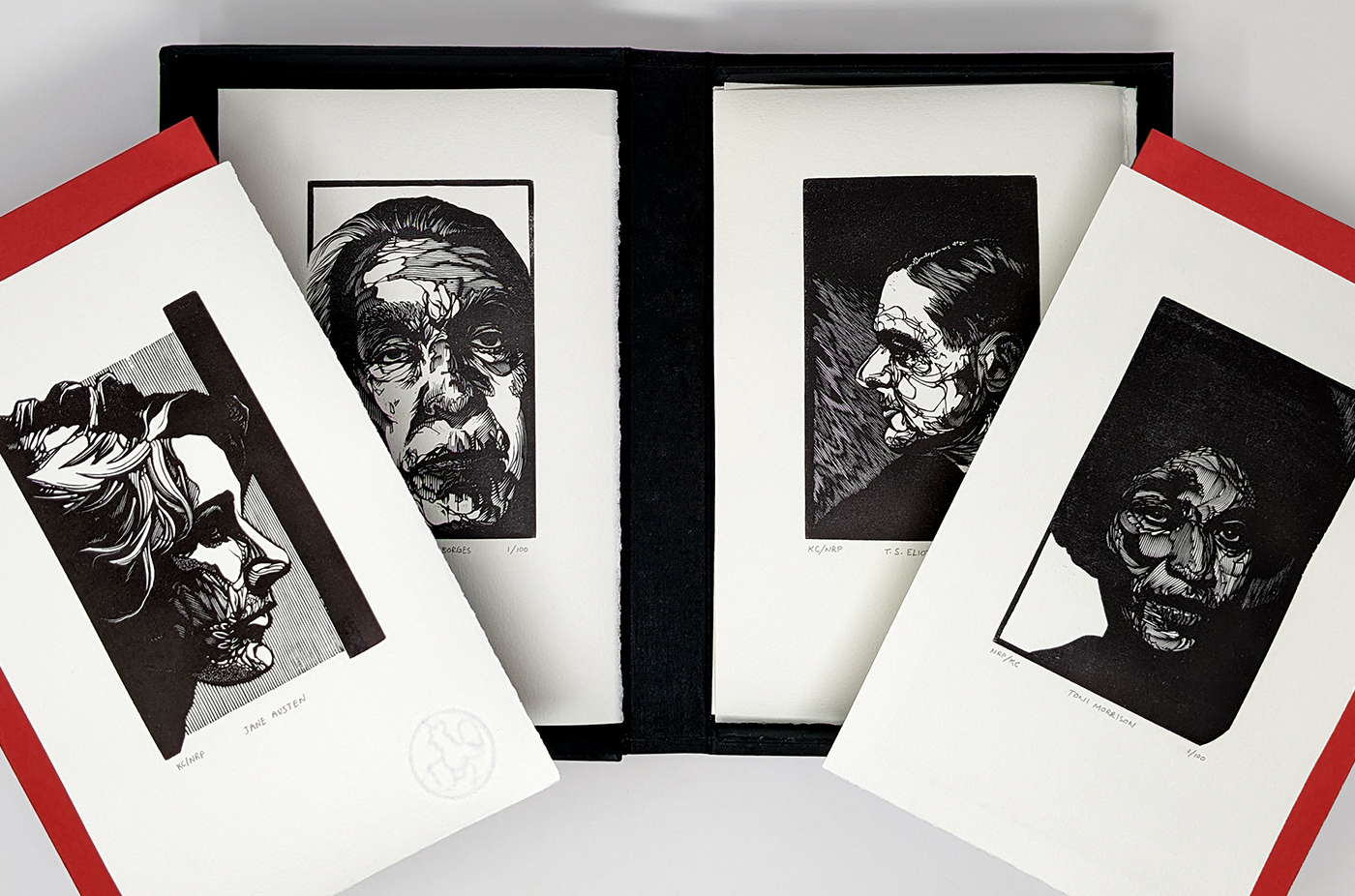 For Make 100, artist Kevin Clinton and No Reply Press are collaborating on a letterpress suite of woodblock portraits. The series, "Impressions," combines much of what the two collaborators love: literature, craftsmanship, artistry, and excellent tactile materials. Each portrait is letterpress printed by hand directly from the block on mouldmade paper and numbered in a limited edition of 100. Figures include Jane Austen, William Blake, Jorge Luis Borges, Willa Cather, T. S. Eliot, Ralph Waldo Emerson, Martin Luther King Jr., Toni Morrison, and Leo Tolstoy.
