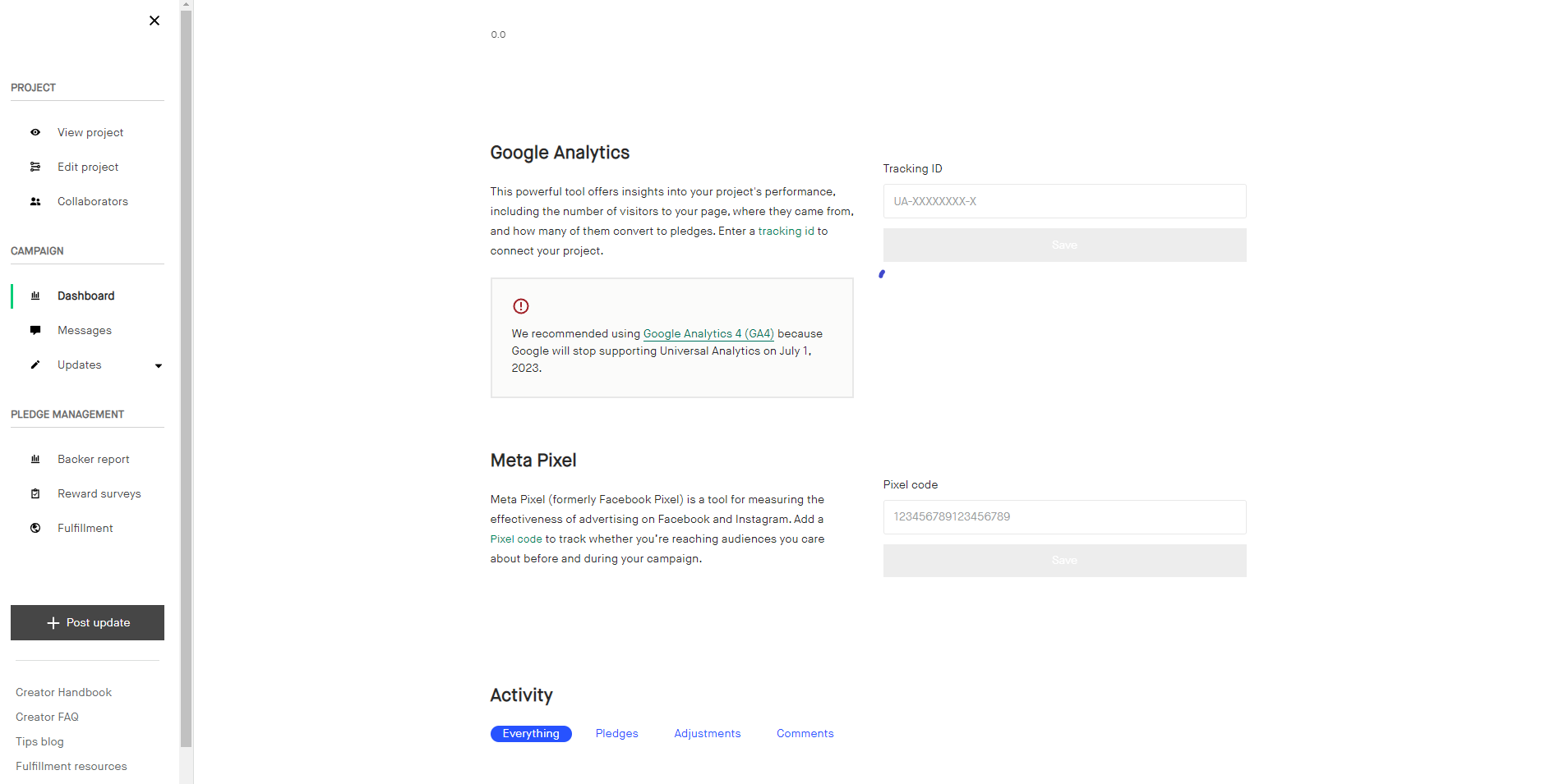 Marketing integrations like Meta Pixel and Google Analytics allow creators to track how backers are getting to their project and to advertise to similar folks via the integration’s respective channels (Google, Facebook, Instagram, etc). These insights and ability to advertise to similar types of backers can make a huge difference for how much funding a creator’s project can generate. In a recent survey, 60% of Kickstarter creators said they wanted support for these types of tools.