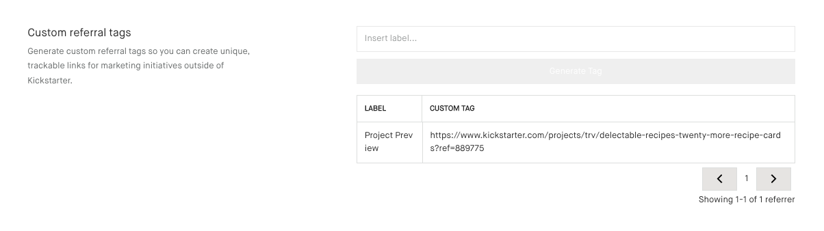 As part of this release of new features, we have also added the ability for creators to add custom referral tags to projects before they launch. This makes it possible to generate unique, trackable links for marketing initiatives outside of Kickstarter. Creators can access this functionality via the Promotions section when building a project.