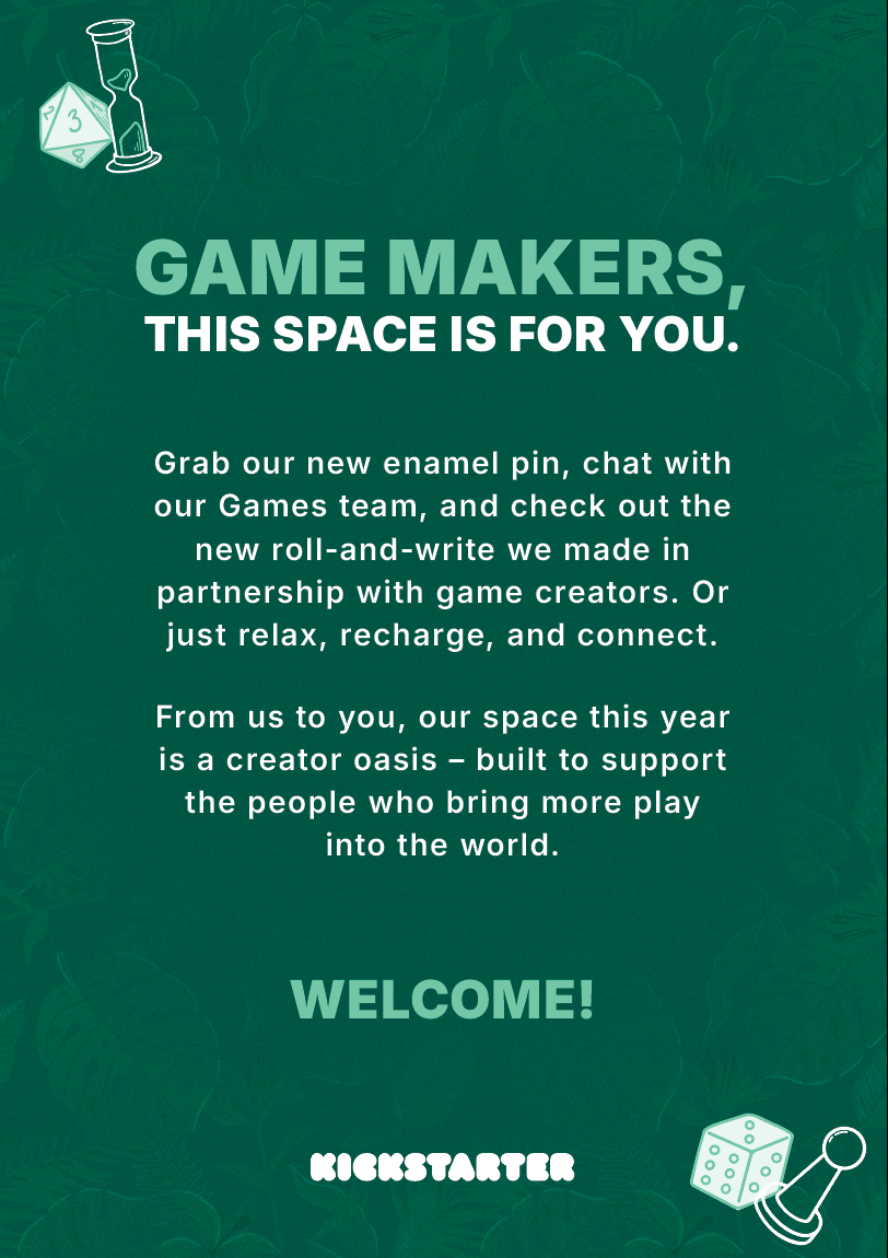 This year, we’re calling our booth a “creator oasis,” a space where creators can rest, recharge, connect with the Kickstarter Games team, connect with each other or check out the new enamel pin and game we’re debuting for the first time at SPIEL. Our creator oasis is intentionally designed to give you the respite and connection you need and the support you expect from Kickstarter. Stop by, hang out – our oasis is your oasis.