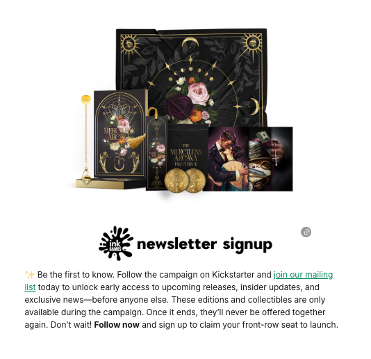 In addition to your Kickstarter pre-launch page, consider using your own landing page to collect email addresses. This gives you another way to communicate with potential backers, share sneak peeks, and remind them about your launch. You can then direct them to follow your Kickstarter project, increasing engagement and ensuring they’re ready to support you from day one. To create a CTA linking to your off-platform page, simply add an image of a button to your pre-launch page and link it to your landing page.