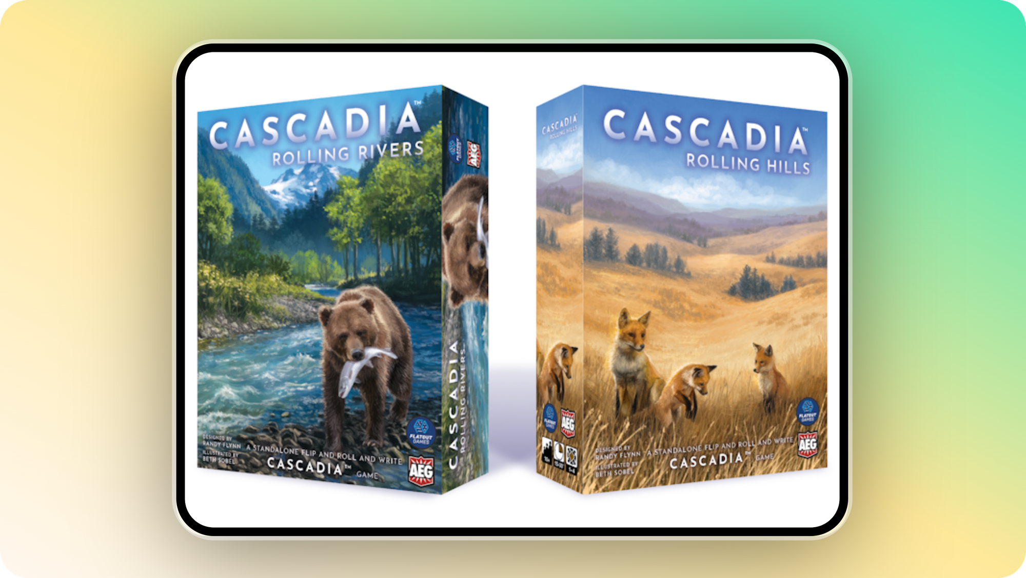 Randy Flynn has been a great friend of the Flatout Games CoLab for many years and when we were working on Calico, our first game, he was one of the early playtesters of the game. While we were working on Calico, Randy was inspired to create his own hex-based puzzle game and the team had the opportunity to play some of his early concepts for a 'dual-layer hex puzzle game'. It was originally called 'Lands and Creatures', so it always had the land and animals theme. When we decided to publish it as our second game, Flatout Games formed a CoLab, or collaborative group of folks to work on the game together. Randy, along with Kevin Russ (designer/developer), David Iezzi (designer/developer), Dylan Mangini (developer/graphic designer), Beth Sobel (illustrator), Shawn Stankewich (designer/developer/publisher), Molly Johnson (designer/developer/publisher), and Robert Melvin (designer/developer/publisher) teamed up to create the game. The theme for Cascadia came after brainstorming a way to differentiate the game from other generic 'nature' themes and as a love letter to the wilderness in our own backyards. The game went through many mechanical and product-related changes. The team focused on streamlining the game and providing an experience that was easy to get into for new players, but had layers of depth for seasoned gamers, not unlike our first game, Calico.